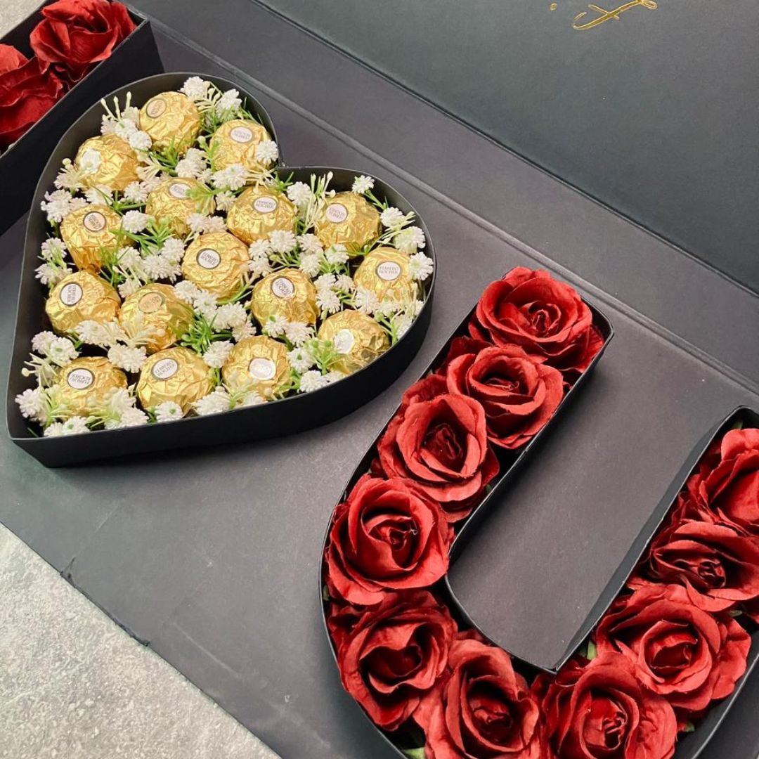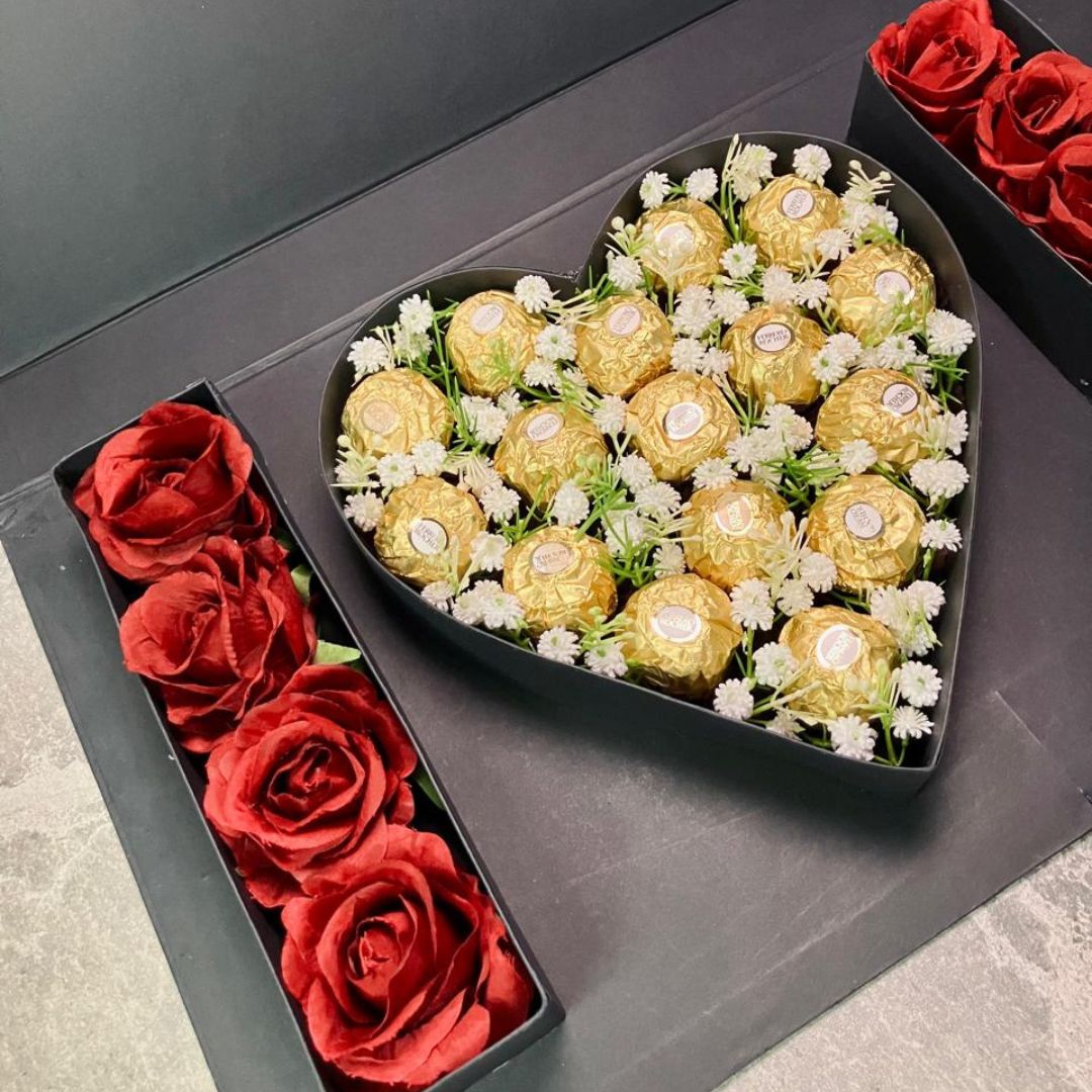 A grand romantic gesture that speaks straight from the heart. Beautifully arranged with Ferrero Rochers and elegant roses, this luxury box is perfect for expressing love in the sweetest way.