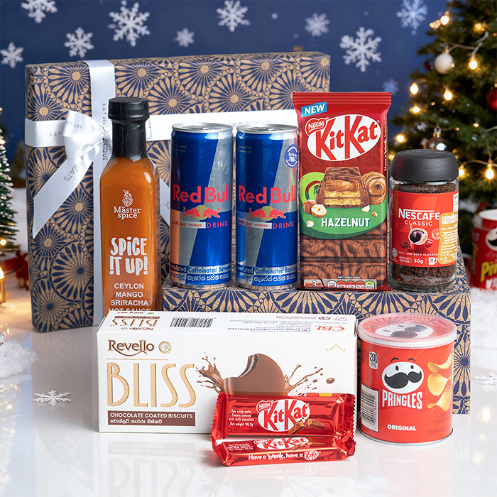 Golden Bliss Gourmet Hamper is a thoughtfully curated Christmas gift box filled with premium chocolates, energizing beverages, and bold festive flavors. From indulgent chocolate treats to exciting spicy notes and refreshing sips, this hamper is perfect for spreading holiday cheer among friends, family, or corporate partners. A delightful balance of luxury and fun, designed to make the season extra special.